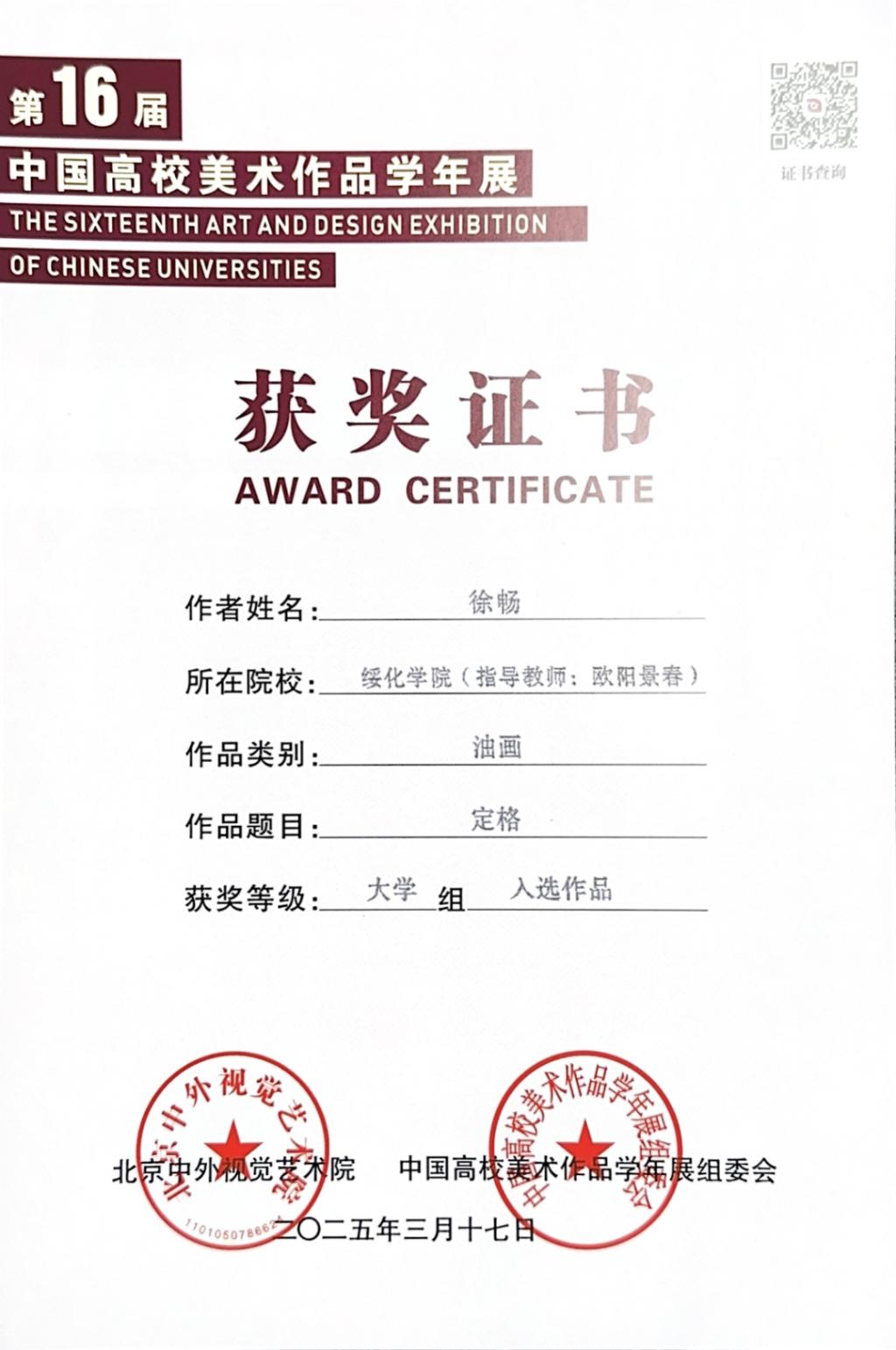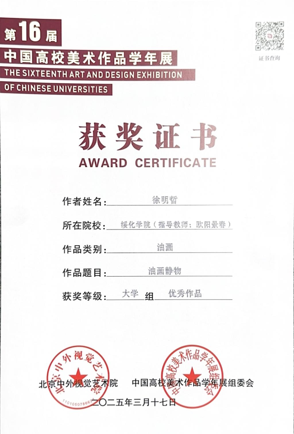 中国高校美术作品学年展作为国内高校美术领域极具影响力的重要赛事,吸引了全国众多高校高校踊跃参与。多年来,欧阳景春老师始终致力于美术教学与创作研究,带领同学从作品构思到到艺术呈现进行系统打磨,并积极参与往届赛事凭借扎实的艺术功底和创新的艺术表达美术学(师范类)专业的多件作品在本次展览中脱颖而出,赢得了评委的高度认可,斩获多个奖项。