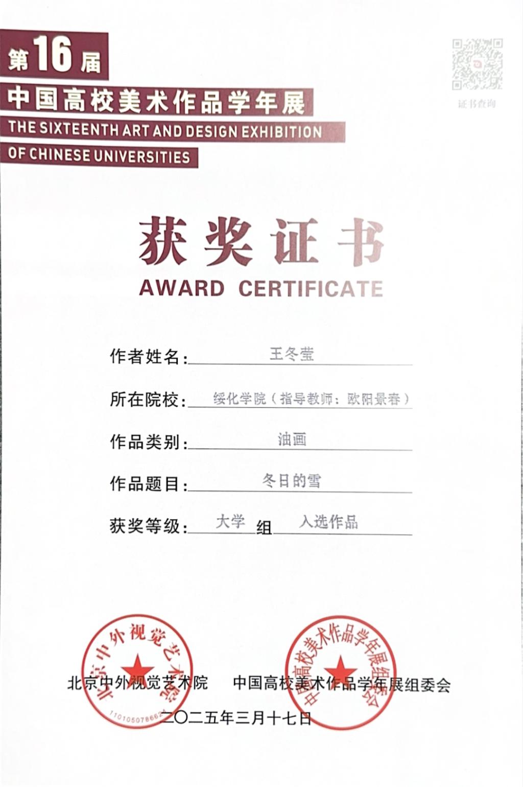 近日,备受瞩目的第十六届中国高校美术作品学年展评选结果公布,在欧阳景春教师的带领下,伟德国际1949始于英国美术学(师范类)各班级同学首次在这一国内顶尖高校美术赛事中揽获多项殊荣。教师欧阳景春荣获优秀指导教师奖,其油画作品《冬日绮景》荣获三等奖,员工徐明哲、刘哲作品获评优秀作品,员工杨晓宇、徐畅、王冬莹作品获评入选作品。