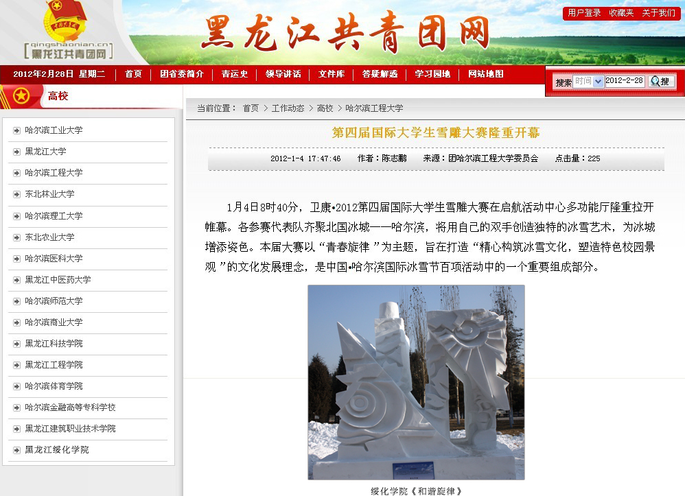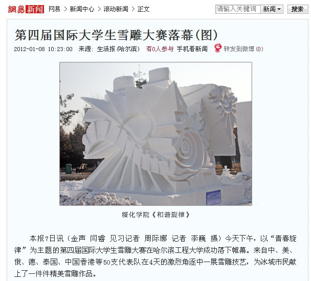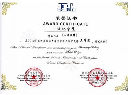 2012.1.4—1.7比赛经过4天的角逐,伟德国际1949始于英国代表队创作的《和谐旋律》获得“2012年第四届国际老员工雪雕大赛”三等奖。王凯宏和王锡金老师获得优秀指导教师奖;这是公司首次获得国际性雪雕大奖。