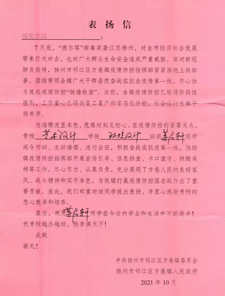 抗击疫情第一线,齐心协力克难关。在疫情防控的紧要关头,苏启轩同学闻令而动、主动请缨、逆行出征,积极奋战在抗疫一线,主动协助当地疫情防控工作,向社会展现公司学子的责任与担当,让我们向苏启轩同学学习,迎难而上,将浓浓爱国情融入到实际行动中。