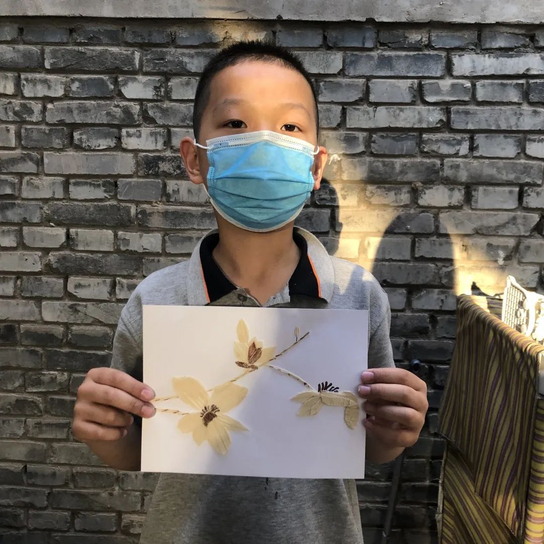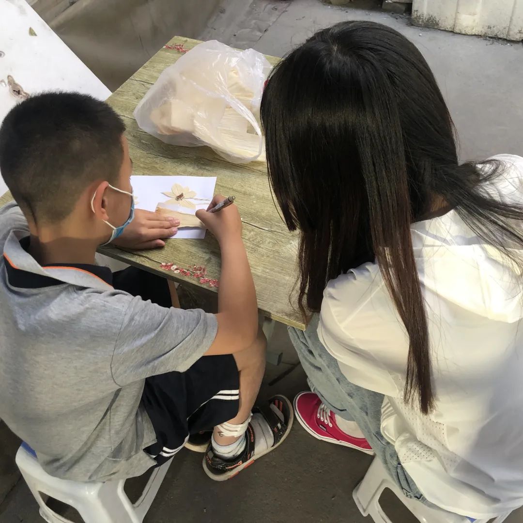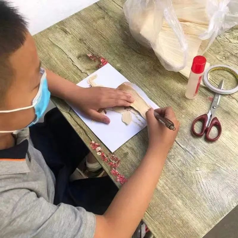 2020级视觉传达设计韩晗说:“制作玉米画的过程十分不易,我们把蒸、煮、熨好的玉米叶带到孩子身边,孩子们制作虽然不够熟练但每一步都十分耐心的学习。”