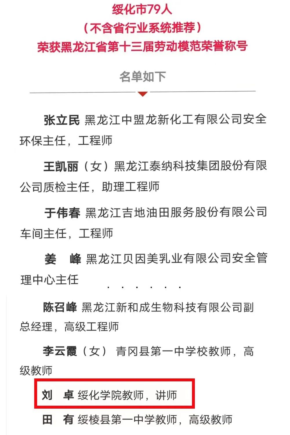 7月6日上午,黑龙江省第十三届劳动模范表彰大会在哈尔滨召开,公司教师刘卓荣获“黑龙江省第十三届劳动模范”。