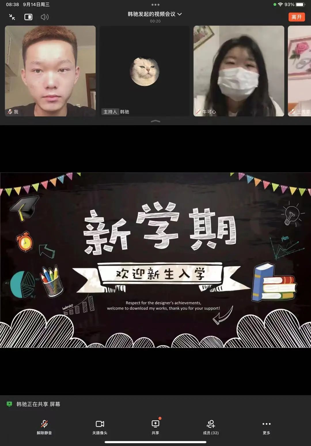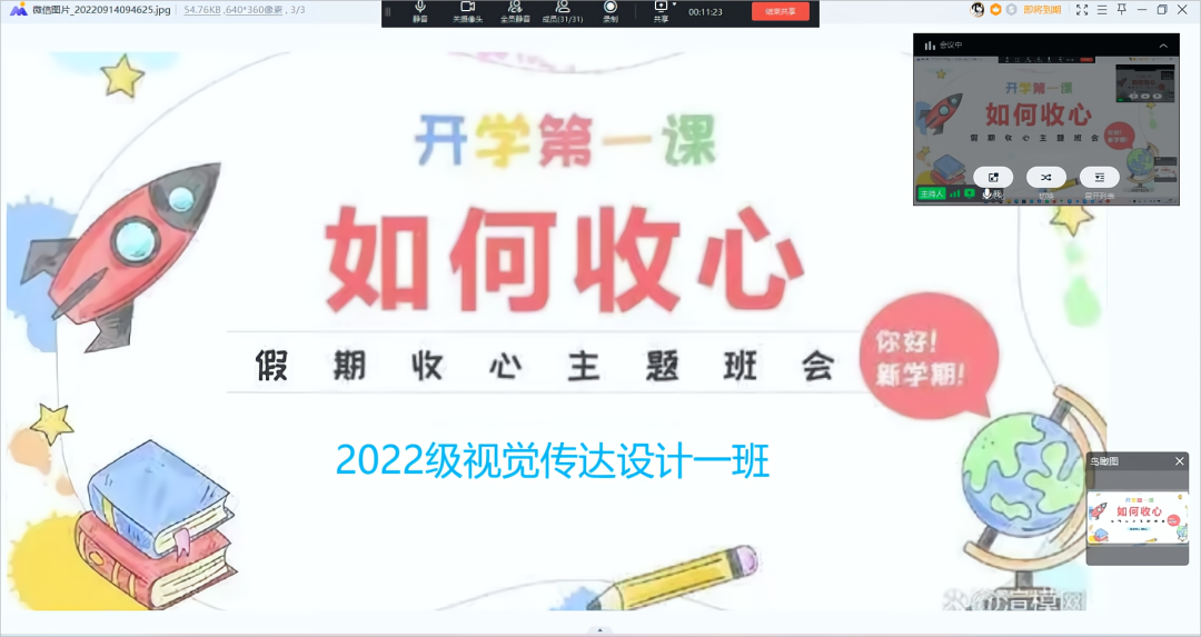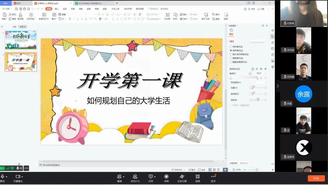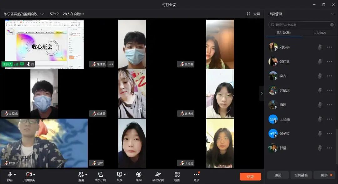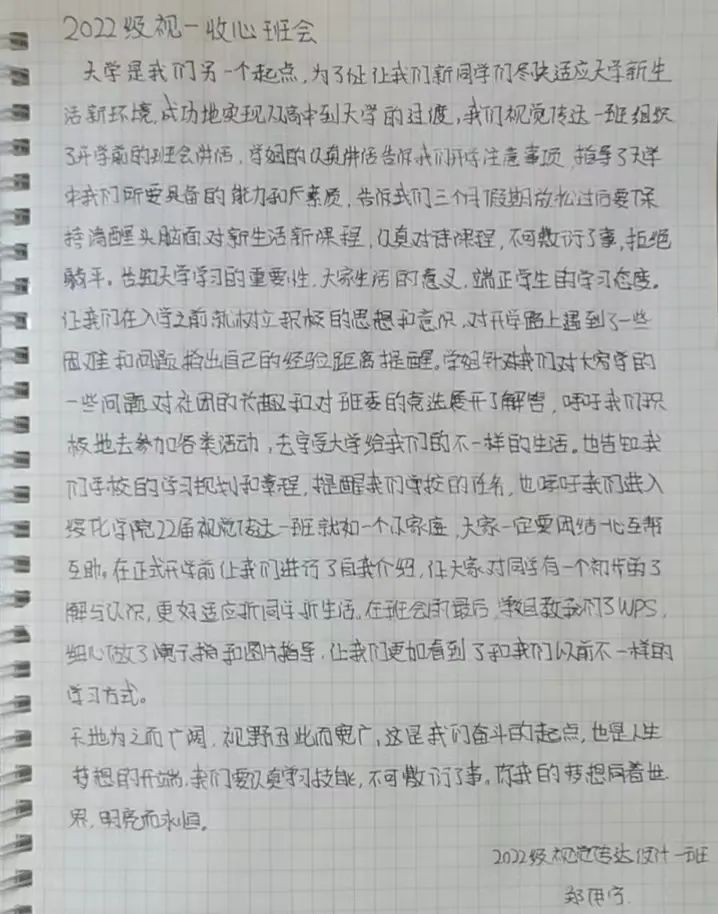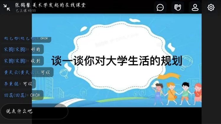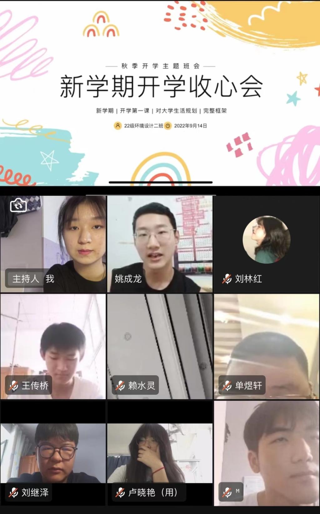 我们度过了大学前难忘的暑假——风采各异,从高中的努力求知考取大学,成为我们人生的又一转折,我们将迎接新的挑战。如今各大学新生已然开学,因疫情缘故我们将网课作为我们老员工涯的前缀,今天的班会,以自我介绍起头,紧张与激动产生,让我们不忘旧友,迎接新友。我们应融入大学新生活,融入新班级,进行有效的自我管理,使生活规律,展自我风采。接着同学们和代班进行问题的提问,表明我们对老员工活的憧憬,让我们将嬉笑中的心收回,让身心踏上大学求知的旅程。