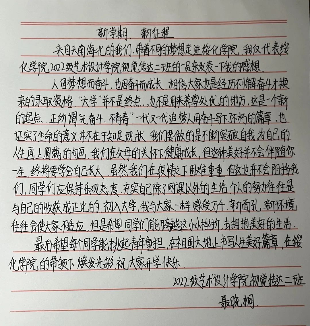 对于我们即将要在这⾥度过将近四年的时光,我对此是特别的期待,期待⾃⼰在这⾥交到很多朋友,期待⾃⼰在这⾥可以取得很多成就。在未来的四年⽣活中,我们要努⼒让⾃⼰的⼤学⽣活变得更加的丰富多彩,更加⽤⼼地专注于学习,不留遗憾。新的学期,我们也要做到更好的全新的⾃⼰,⼀起加油和奋⽃吧!