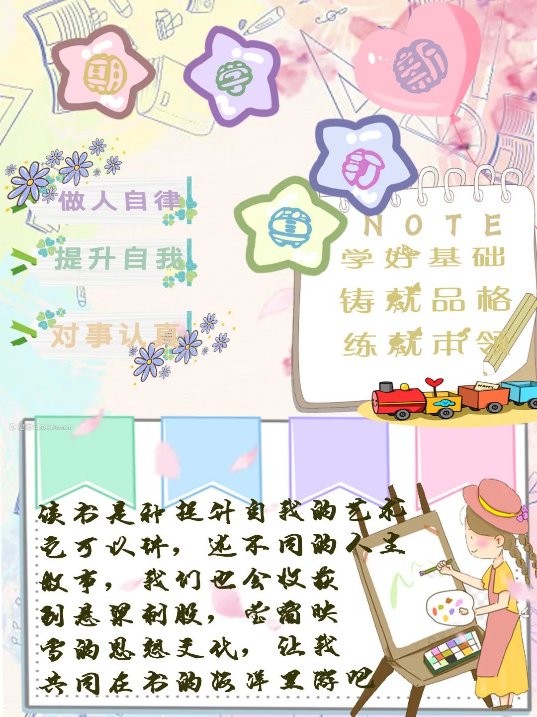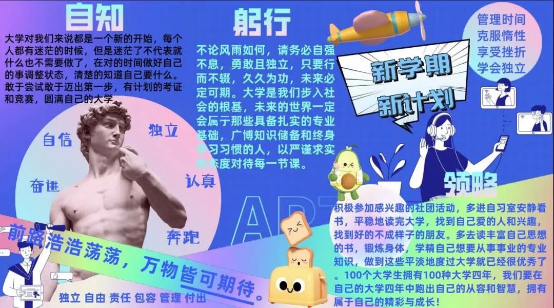 第三,要自律、自觉、独立。养成阅读的好习惯,建立自己的知识库,养成规律的作息时间,每天早睡早起。坚持运动,积极参加健康有益的活动,提高身体素质。