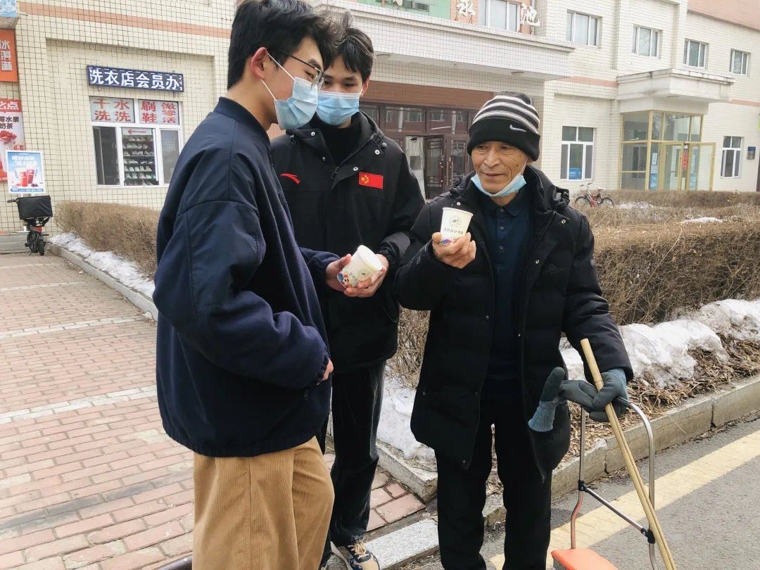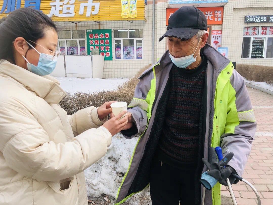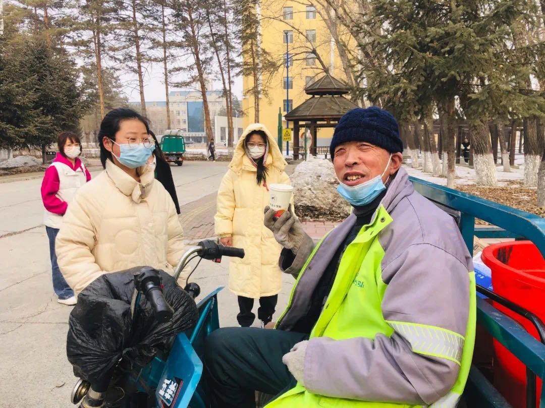 每天的清晨总有一些人在清理校园的垃圾,即使天气寒冷,环卫工人依然兢兢业业的为人们服务,他们没有豪言壮语,只有默默奉献,辛勤的汗水洗刷着校园的污垢,为同学们创造着一个崭新而又温馨的环境。为了感谢这些为校园服务的环卫工,下午2时,同学们拿着暖瓶与纸杯在校园内穿梭,分路段为辛勤工作的环卫工人们送上心意。礼轻情意重,一杯热水代表着同学们对环卫工人的谢意,感谢他们寒风中坚守岗位,感谢他们所付出的辛苦和汗水,感谢他们为创造整洁优美的校园环境所作出的贡献。寒风的来袭也不会阻挡同学们的热情,同学们将温暖的水依次送到环卫工人的手中,环卫工人接过热水后发自内心的笑容,让同学们感慨万千。