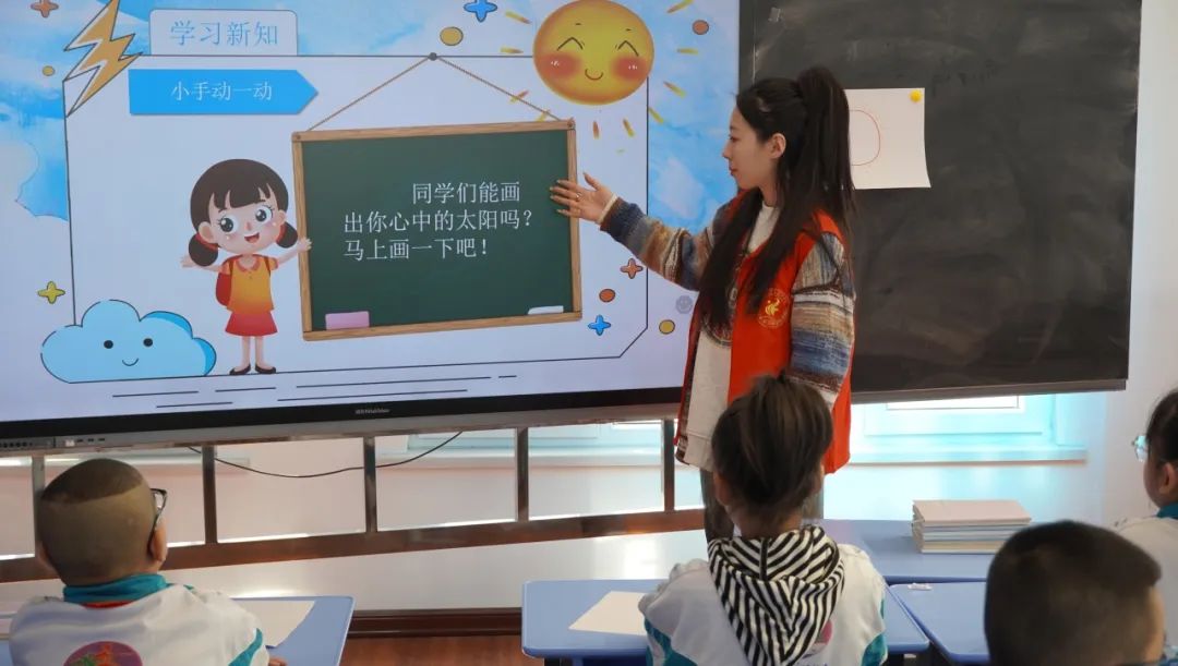 公司2022级美术学(师范类)员工代表杨晓宇与2023级员工张紫煊一同给孩子们上了一节由美术课和品读经典相结合的教学课程,课程开始给同学们介绍了读书的好处,并鼓励同学们要“以经典为友,与名著为伴”在读书中提升自我。杨晓宇同学以“太阳”为课题给同学们讲述在大自然里太阳的模样,科普了太阳的特征;在教学过程中,通过许多不同表现形式的作品,帮助员工去不断开拓思维,启迪想象。运用不同线条、不同颜色、拟人等方式描绘心中的太阳。在此次课堂的开展中公司两位员工用富有亲和力的语言,开放且动态的教学内容,激发员工的上课激情与创作热情,并于与同学们创作了属于自己的太阳。