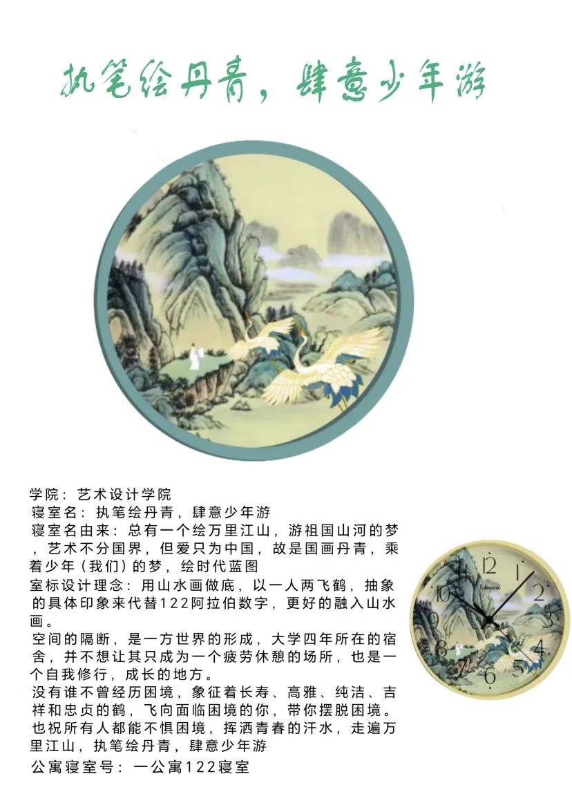 画笔勾勒出心中的理想家园,色彩描绘出寝室的独特魅力。同学们用柔和的线条和温暖的色彩展现出寝室的和谐氛围;以创新的设计表达出对未来的憧憬;以传统文化为灵感,用古典元素传承着中华民族的优秀文化。这些室标独具匠心的设计无一不展现着静雅的宿舍之美。