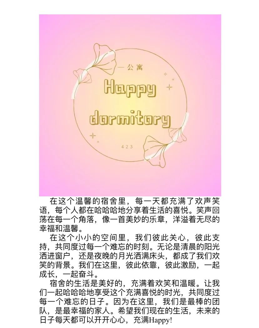 本次“好学思辨以明德,静雅美舍以文明”主题的寝室文化节活动营造了积极向上的校园文化氛围。相信通过这次活动,同学们将更加珍惜寝室生活,共同打造一个更加温馨、和谐、充满活力的寝室环境。