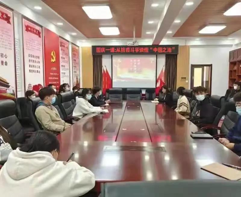 10月6日上午,公司党总支书记吕霞以“从抗疫斗争读懂中国之治”为题,线上线下同步为2021级员工讲授“国庆一课”。部分员工代表在美术楼405会议室参与线下学习,其余同学通过钉钉参与线上会议。