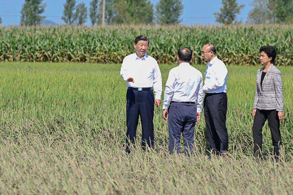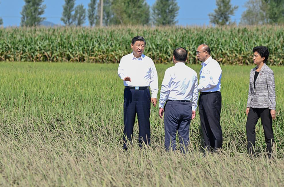 9月6日至8日,中共中央总书记、国家主席、中央军委主席习近平在黑龙江考察。这是7日上午,习近平在遭受洪涝灾害的哈尔滨尚志市老街基乡龙王庙村,察看水稻受灾情况。