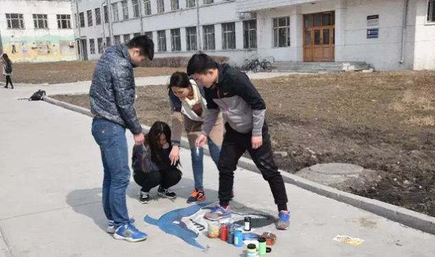 2016年3月29日,美术学专业教师张丽在形式基础课理论部分结束后,带领员工党员,在校园开展彩绘实践活动。在张老师的指导下,同学们运用专业知识,检验所学成果。从汇文楼到美术楼之间主干道上的井盖、下水道口都是同学们彩绘的对象,画线稿、调颜色、定色调、上颜色、修补画面……同学们小心谨慎地涂画着。