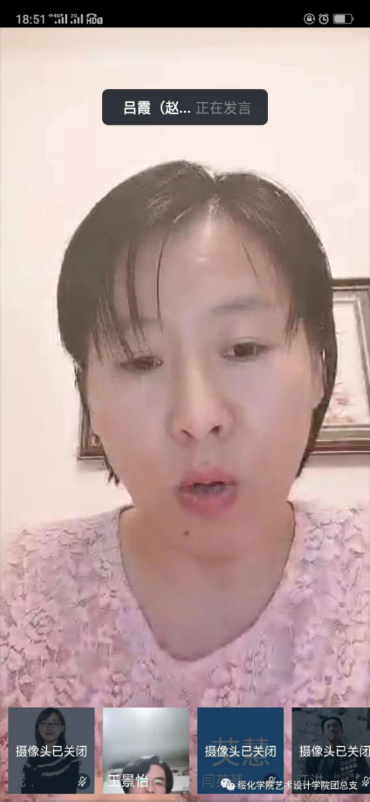 党总支书记吕霞结合美术支部实际,就做好疫情防控和近期重点工作强调四点意见:一是继续做好疫情防控工作,严格执行进出城报备制度;二是有序开展好线上教学,做好复学准备;三是发挥党员带头作用,下功夫做好毕业生就业工作;四是把疫情作为一次现实教育活动,引导员工增强“四个意识”、坚定“四个自信”、做到“两个维护”。