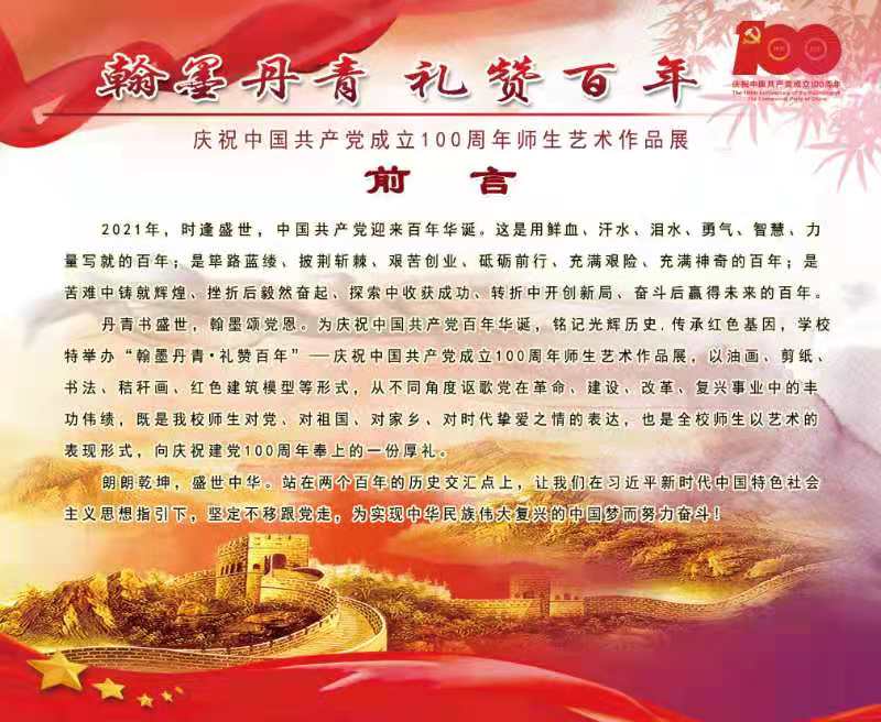 百年征程波澜壮阔,百年初心历久弥坚。为迎接中国共产党成立100周年,重温百年党史,6月7日,全校“翰墨丹青,礼赞百年”师生艺术展暨党史学习教育主题艺术展在美术楼开展。