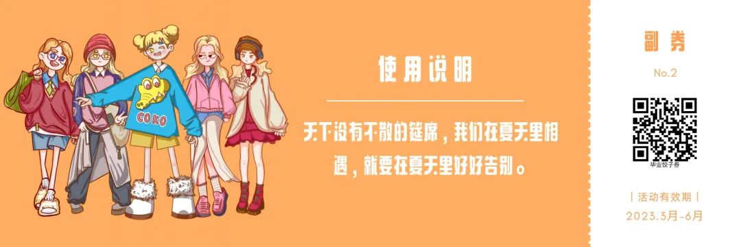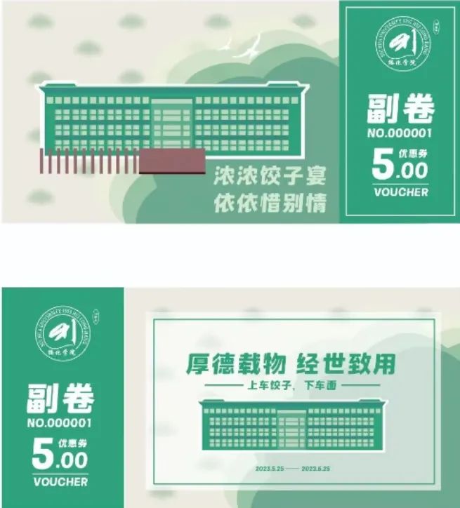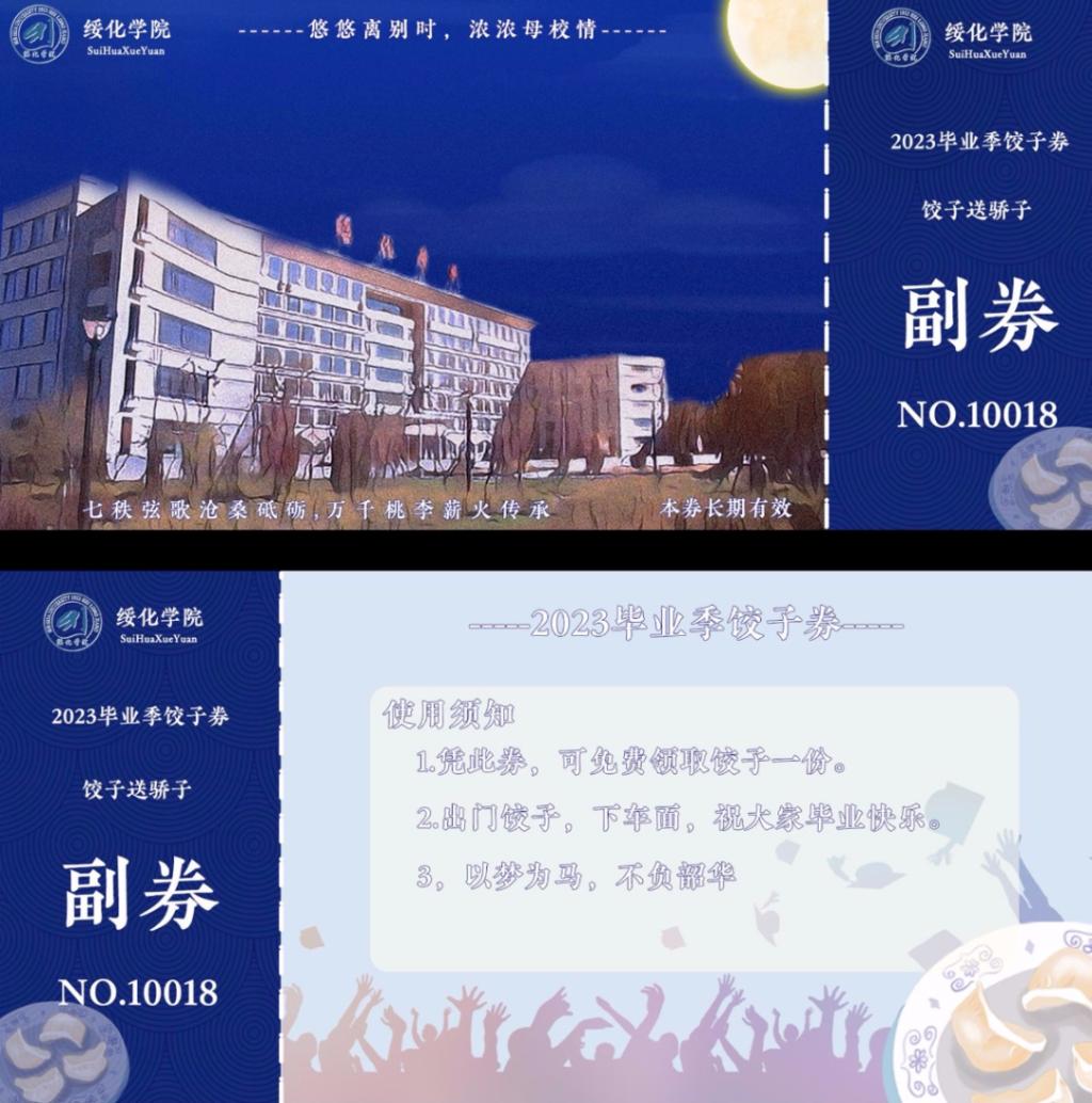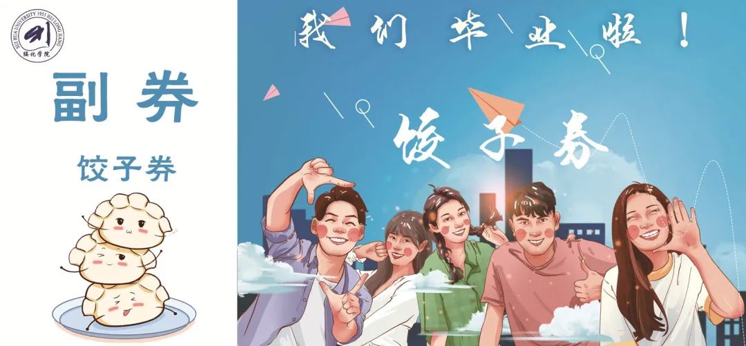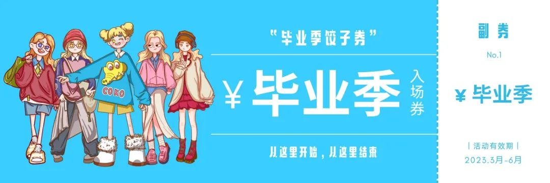 采用插画风格,色调以蓝色为主,蓝色象征自由,饺子券正面左侧是一幅有关毕业的插画,希望23届毕业生前程似锦。右侧是饺子的插画,希望19级毕业生,凭副券常回母校看看。每一段旅程的终点,都是下一段旅程的起点。愿19级毕业生在拥抱未来的大道上,坚定不移地追光前行。