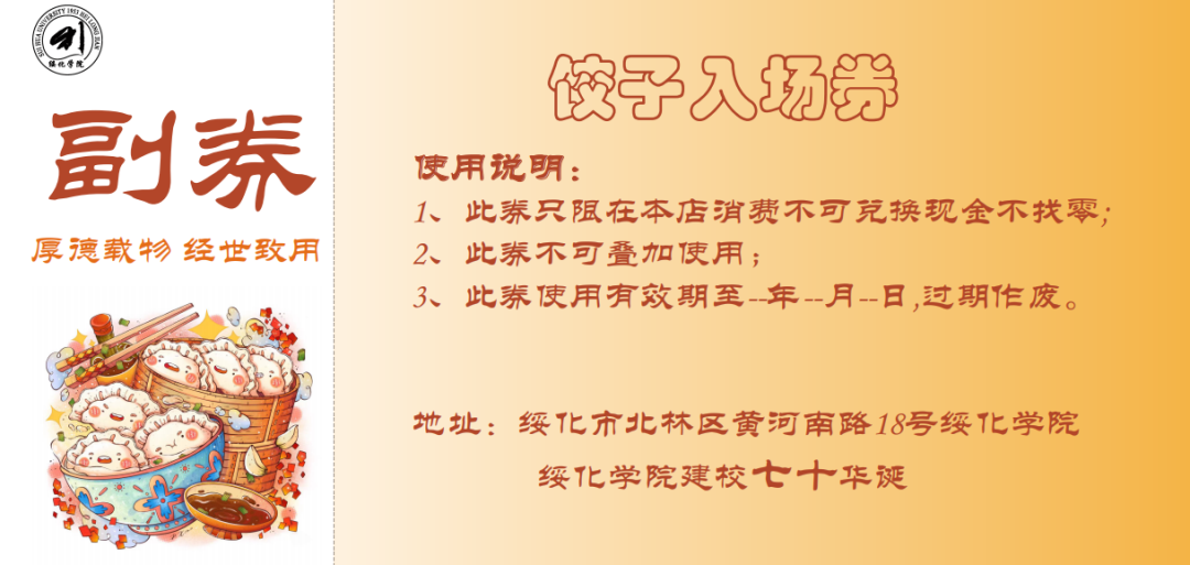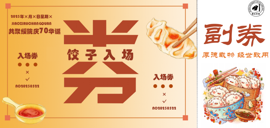 饺子券的总色调是暖心的黄色渐变。整体围绕“饺子”,“70周年”、“毕业”这三个关键词展开设计,这张饺子券并不是一张普通的兑换券,涉及到毕业,建校70周年,具有很多重要意义,因此在设计时用到许多相关元素。饺子券印有公司logo。在副券背面部分印有我们的校训:“经世致用,厚德载物”引起员工们的美好回忆赋予了饺子券独特的纪念意义。