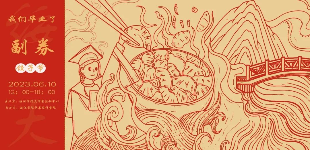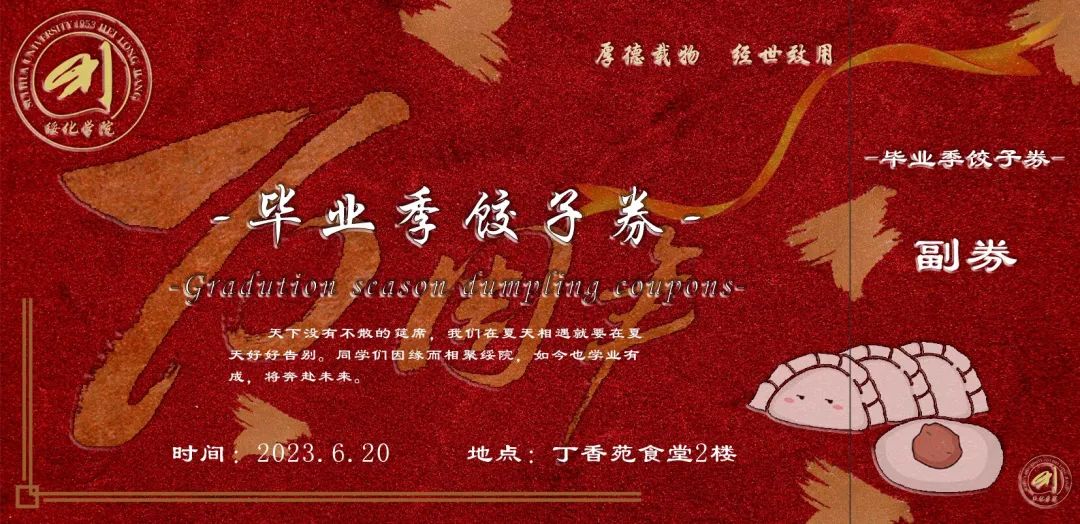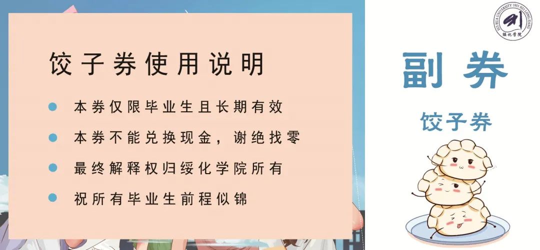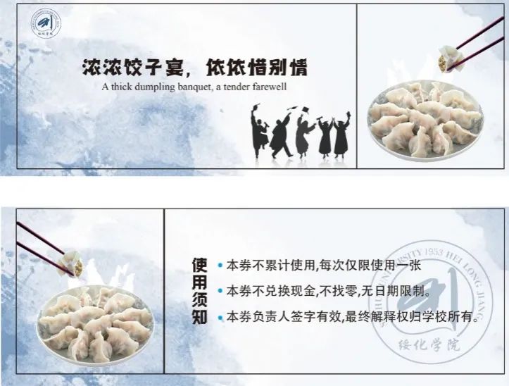 背景采用了水墨画风格,跟校徽的颜色相呼应。校徽放在左上角,右下角放了员工毕业丢毕业帽的剪影照,表示毕业季即将来临。同时也形成了对角线构图,起到平衡稳定画面的作用。副券比较简洁明了,就是饺子的图片,代表这是饺子券。反面就是写使用饺子券的文字说明,然后将校徽放大降低透明度,形成一个水印logo。