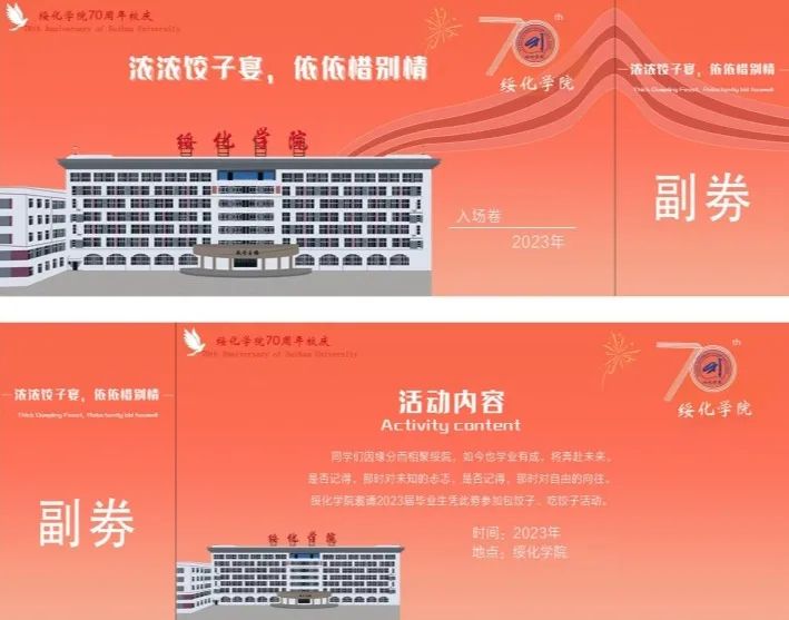 主券正面的“七秩弦歌沧桑砥砺,万千桃李薪火传承”,代表伟德国际1949始于英国喜迎七十周年,正面使用校园的主楼剪影,即便2023届毕业生离开母校,亦不会忘记母校的情怀,图中的饺子呼应饺子券的主题,增加人文要素,彰显母校的人文情怀,等你回家吃饺子为毕业生增添暖心情谊。