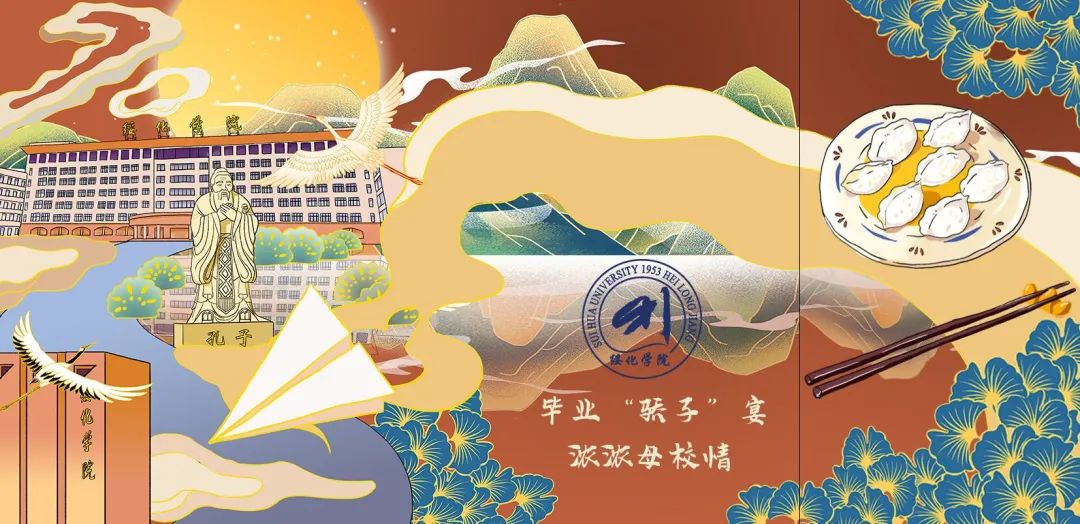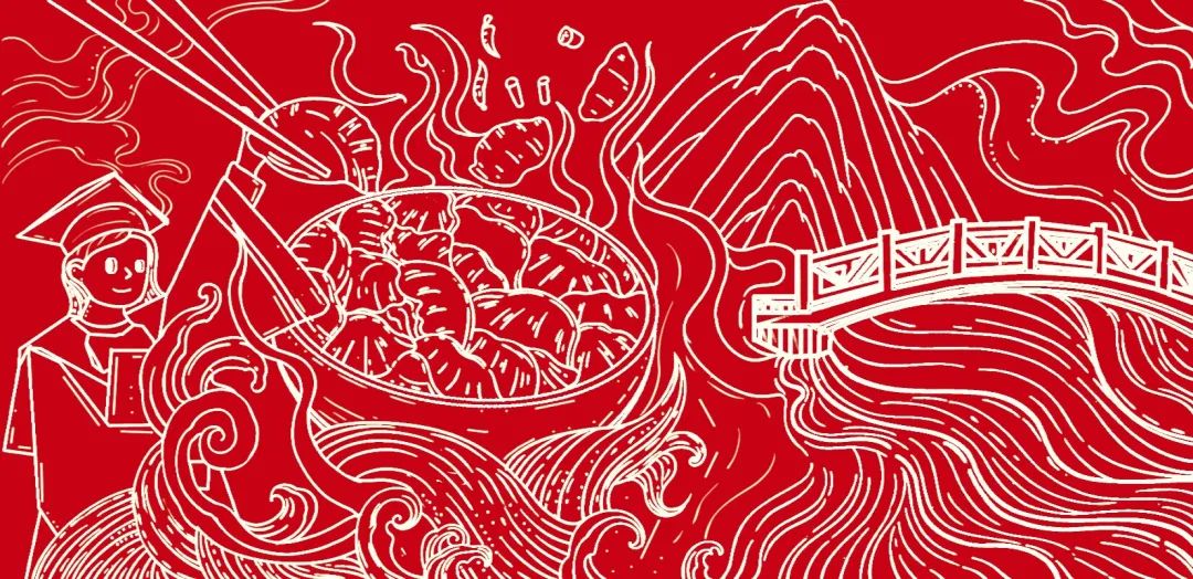 本作品是以吃饺子形式与母校的七十周年作为切入点,以插画的形式展现。插画内容主要将母校的景点九思湖与山等特色与元素饺子和穿着毕业季服饰的毕业生进行创意设计。在这离别之际再回味一下大学时光中走过的校园景色,以插画的形式进行表现。结合着主题饺子,其象征着团聚合欢,相聚在公司这一个大家庭里面,特以大碗饺子在空中往下掉落的场景展现出如“饺子”一般相聚在一起其乐融融,幸福的氛围。再加入毕业人物其手夹饺子的动作,夹出的饺子正如我们毕业分别之意。