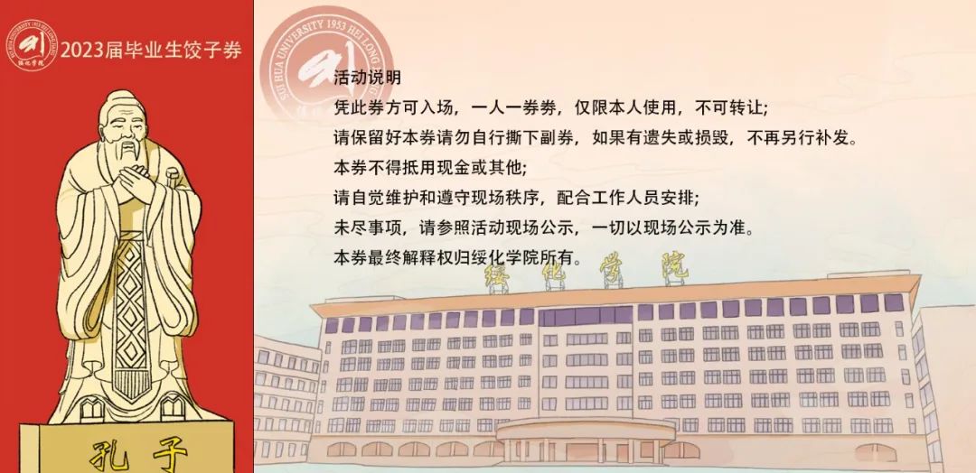 选取公司里各种特色的景点进行绘制,前景是校门寓意着学子们从校门走来也寓意着公司的70年历程。路旁的孔子像寓意着谦虚好学的优良美德也彰显校训“厚德载物,经世致用最后”,远景是教学主楼也是员工们主要上课的地方,天空的云彩是“70”的形状表现70周年校庆也寓意着公司以及员工们未来的道路更加光明璀璨。副券饺子独立设计出来,撕下不影响画面主体,饺子券主体可以当做书签保存,而副券的饺子形象的表现了此次活动,副券反面绘有孔子像也可以用来写下美好的愿望。