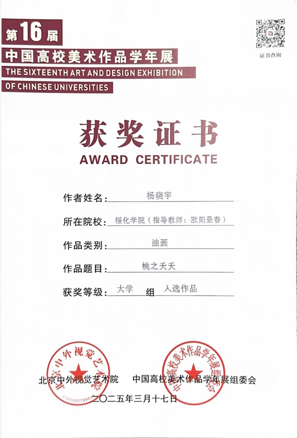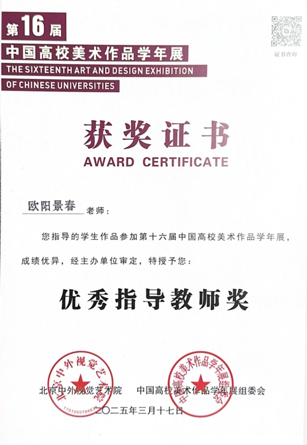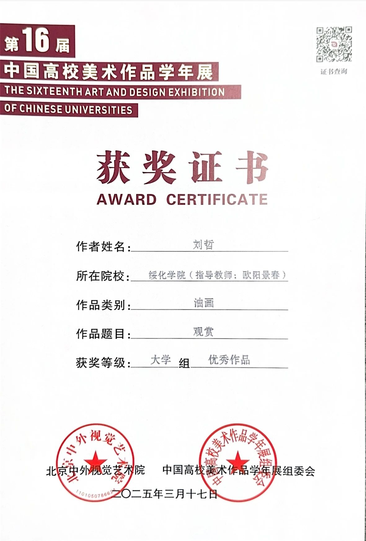 中国高校美术作品学年展作为国内高校美术领域极具影响力的重要赛事,吸引了全国众多高校高校踊跃参与。多年来,欧阳景春老师始终致力于美术教学与创作研究,带领同学从作品构思到到艺术呈现进行系统打磨,并积极参与往届赛事。凭借扎实的艺术功底和创新的艺术表达,我院美术学(师范类)专业的多件作品在本次展览中脱颖而出,赢得了评委的高度认可,斩获多个奖项。