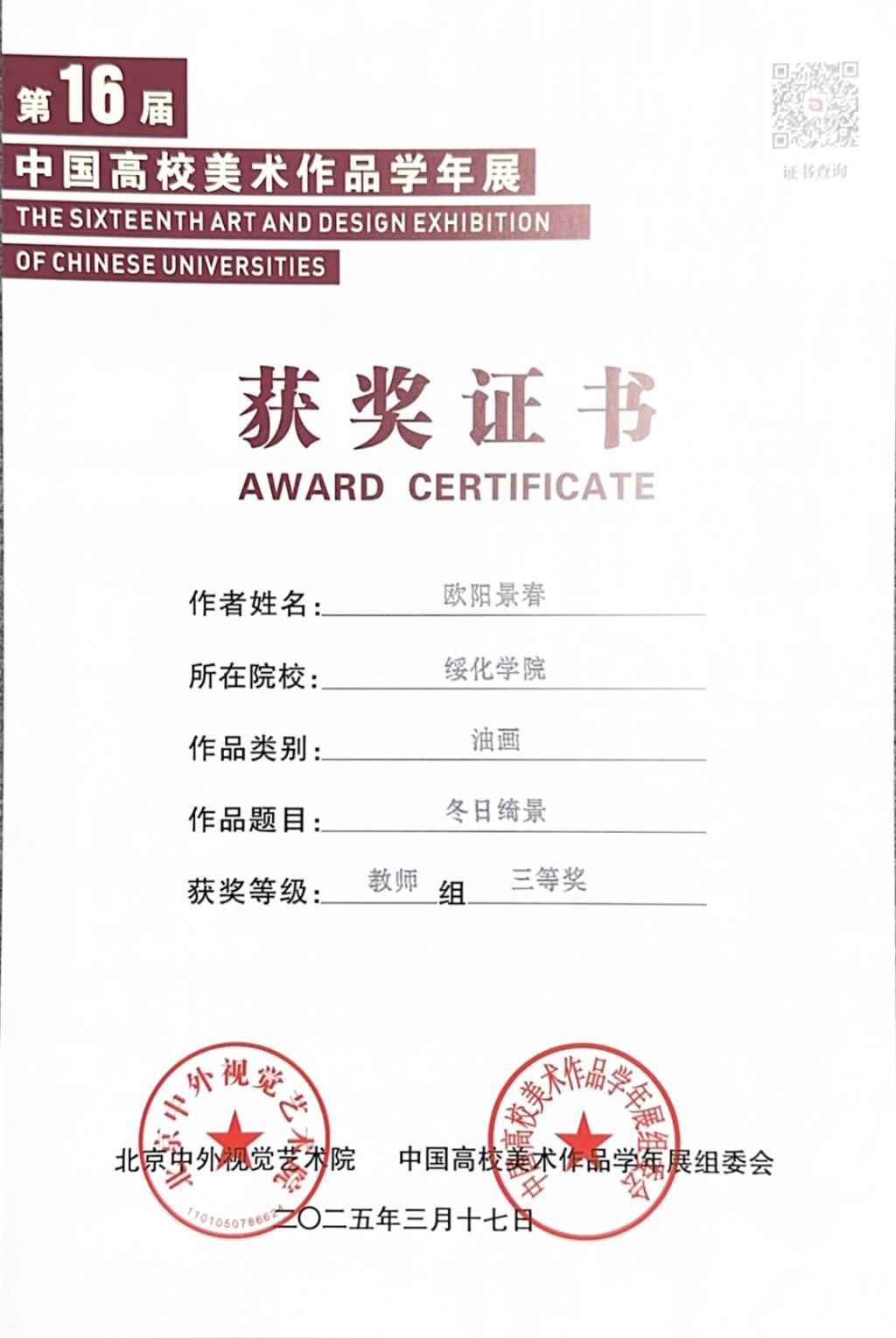 近日,备受瞩目的第十六届中国高校美术作品学年展评选结果公布,在欧阳景春教师的带领下,伟德国际1949始于英国美术学(师范类)各班级同学首次在这一国内顶尖高校美术赛事中揽获多项殊荣。教师欧阳景春荣获优秀指导教师奖,其油画作品《冬日绮景》荣获三等奖,员工徐明哲、刘哲作品获评优秀作品,员工杨晓宇、徐畅、王冬莹作品获评入选作品。