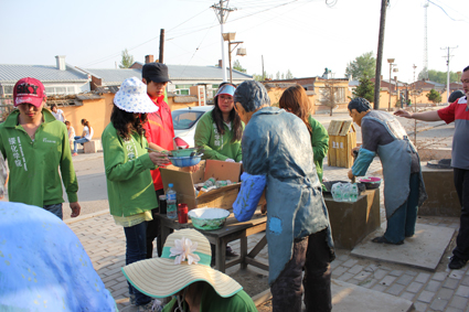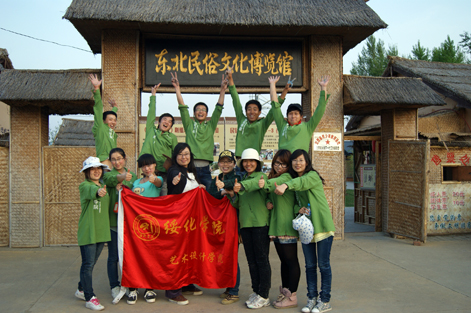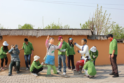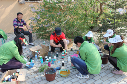 村子的主路——关东民俗旅游文化大道,全长1500米,民俗大道两侧是再现关东民俗民风的民俗景观雕塑60组,共计166个人物和动物造型,人物形像栩栩如生,故事情节凝聚着关东民俗的精髓。这些雕塑都是公司师生在2008年设计完成的,由于年久、天气等原因部分雕塑已破损,大部分雕塑的颜色都已脱落,为加强院县共建,服务地方经济、建设地方文化,公司再次组织师生14人历时两日,顶着初夏的炎日提前完成修复任务。