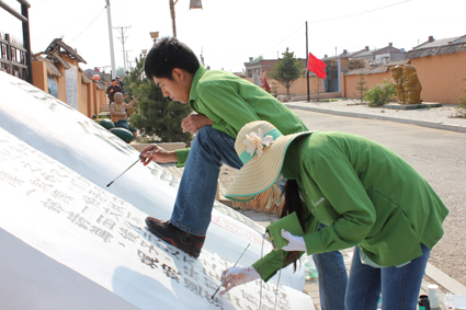 进行实地勘察,并于当天上午就投入到了紧张、繁重的修复工作中。去过黄崖子村的人都知道,民俗景观大道位于该村中部,贯穿东西,大道两头同一望无垠的黑土地相连。强劲的季风卷着尘土,沙粒经常袭扰着工作中的师生们,帽子被吹得满天飞,口鼻、耳朵、眼里被吹得满是尘土。民俗雕塑的骨架由钢筋和铁丝捆绑、焊接而成。这些钢筋铁骨会让雕塑在狂风暴雨中岿然不动。但无法处理的锋利的钢丝接头,让雕塑身上布满的“铁齿铜牙”,轻而易举地便可穿透师生们作业的手套,划破他们的手掌。但是同学们拿出了公司坚毅、执着的优良作风,提前一日完成了所有的修复工作。