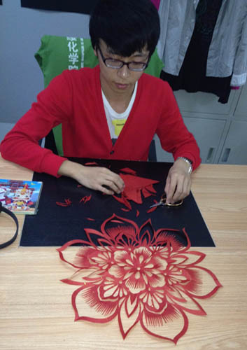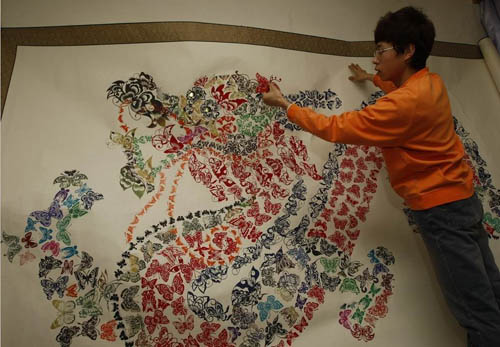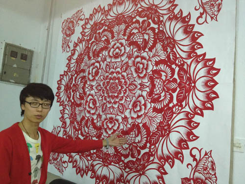 刘卓在展示大型剪纸作品。《龙腾盛世,蝶舞中华》。