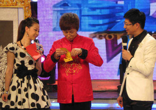 刘卓在黑龙江电视台《能人驾到》节目录制现场展示剪纸技艺。(刘卓本人提供)