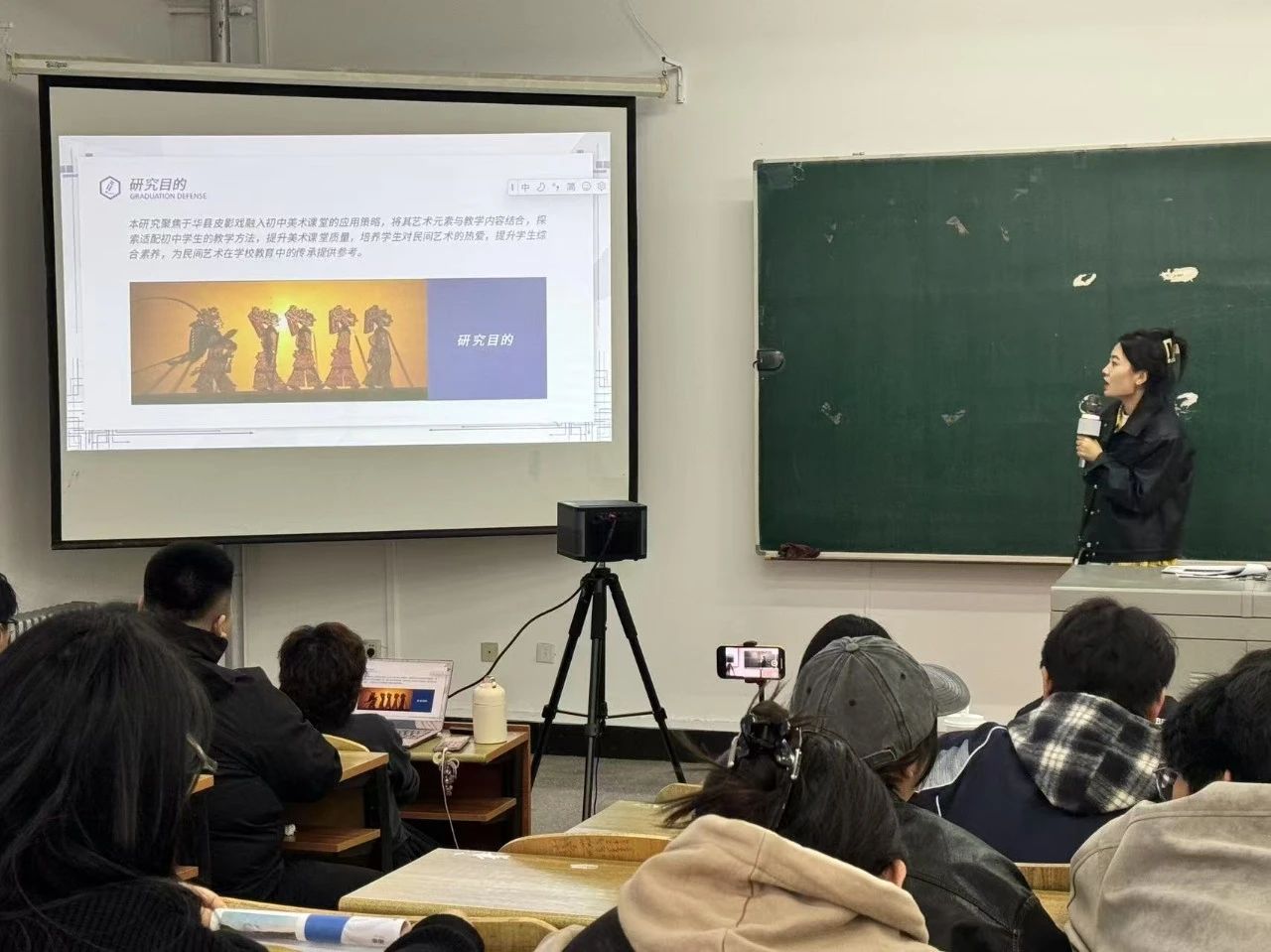 答辩过程中,美术学(师范类)八位专任教师鼓励大家以自信姿态展示所学,以清晰逻辑呈现研究背景、方法、过程与结论,深度剖析作品的创新性与教育价值。2025届毕业生通过PPT从美术创作实践,公司产品研究等方面展示成果。评审教师从作品创新性、学术性、教育理念应用及艺术表现手法等方面进行提问与点评,肯定了毕业生的专业能力与创新思维,同时指出部分作品存在的问题,如创意表达保守、教学设计理论与实践相结合不紧密等,并提出修改建议。