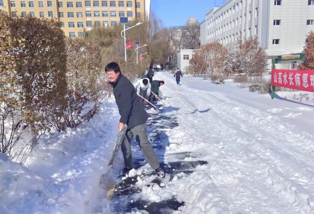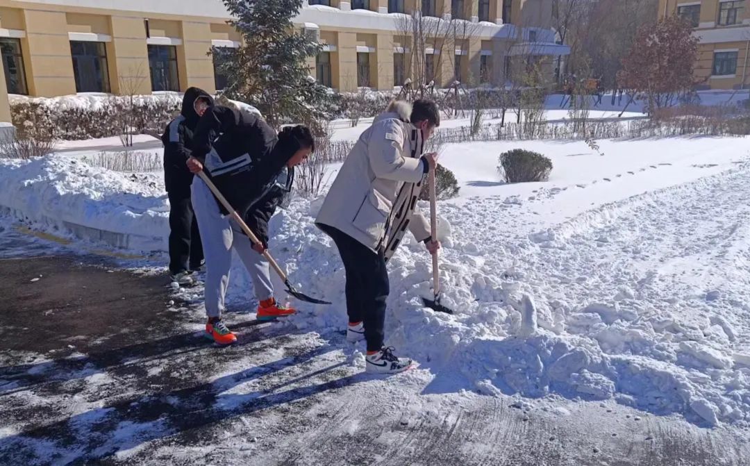 活动伊始,老师和同学们“全副武装”,拿好铲雪工具,蓄势待发。经理董国峰强调雪天路滑安全第一,一定要做好保暖措施。银装素裹的世界里,雪意浓厚,迎着早晨十点的暖阳,雪花反射出点点星光,承载着老师的浓浓关爱之情,活动有序地开展着。