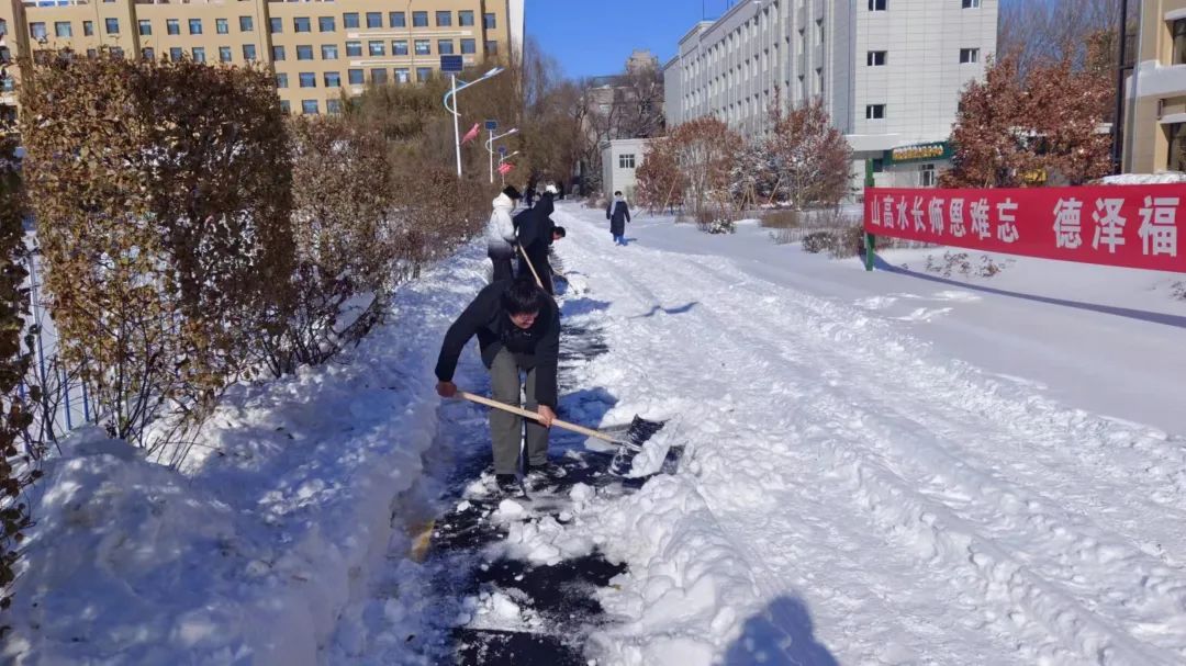 活动中老师与同学们分工合作,推、铲、扫、堆各种方式齐上阵。在热火朝天的铲雪氛围下,寒意渐散,暖意袭人。活动如火如荼的进行着,许多老师和同学脱下帽子,去感受雪意清冷,疏解劳动带来的燥热,也有拄着铁铲稍事休息的。雪越铲越多,盖上厚厚雪被的柏油路娇羞地向大家展示它本来的样子。