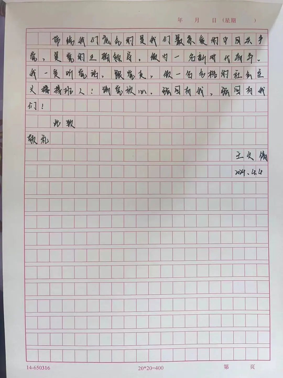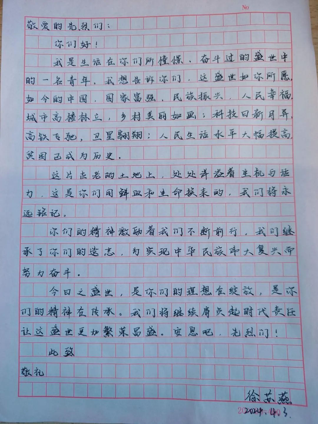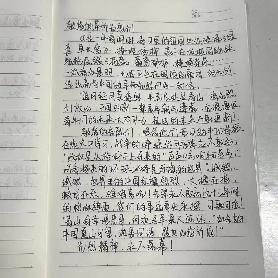 此次活动采取为先烈写一封信的形式,同学们笔下满怀哀思和感恩的情怀,跨越时空,追忆往思,用真挚的情感表达对先烈们最崇高的敬意。本次活动不仅是一种缅怀,更是一种精神的传承,引导同学们树立正确的价值观,培养学习先烈精神、赓续红色血脉。
