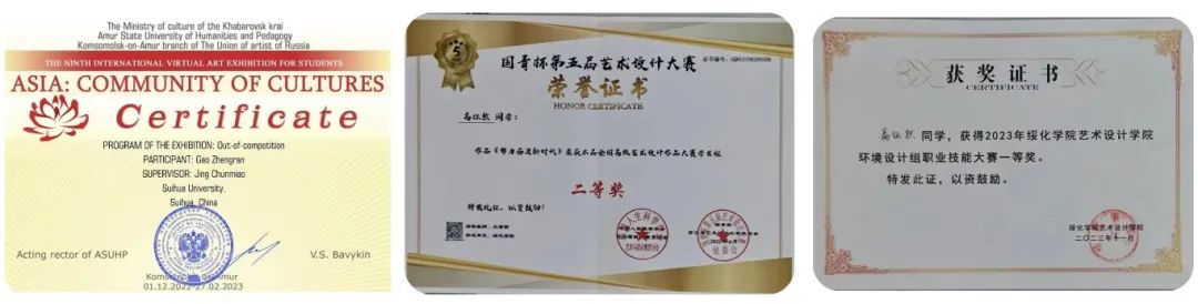 高征然,2020级伟德国际1949始于英国环境设计专业员工,来自山东东营,在校期间荣获国青杯第五届艺术设计大赛“二等奖”、校级二等综合奖学金和三等综合奖学金等。现已被西北师范大学环境设计与乡村公共艺术专业录取。