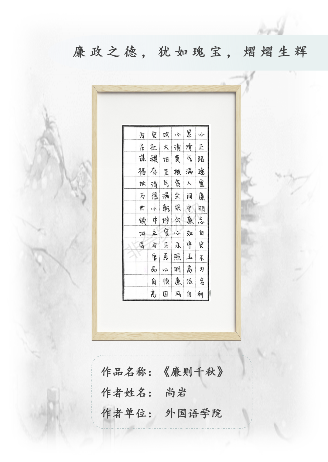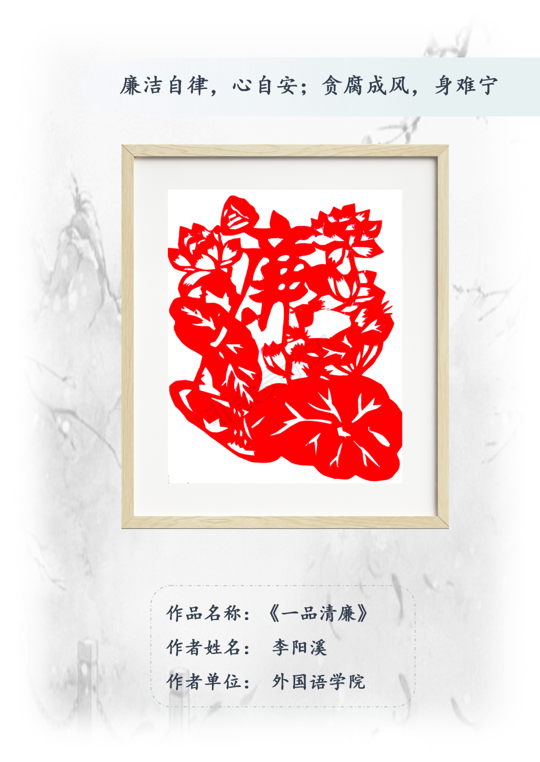 为深入学习习近平新时代中国特色社会主义思想,贯彻落实党的二十届三中全会关于“发展社会主义先进文化,弘扬革命文化,传承中华优秀传统文化……激发全民族文化创新创造活力”精神,扎实推进公司廉洁文化建设,进一步营造崇廉尚廉校园氛围,在全校范围内组织开展“廉风润雅”主题文化作品征集活动,宣传崇尚廉洁、鄙弃贪腐的思想理念,弘扬清正廉洁、勤政为民的社会风气。