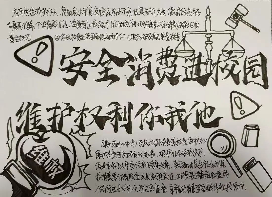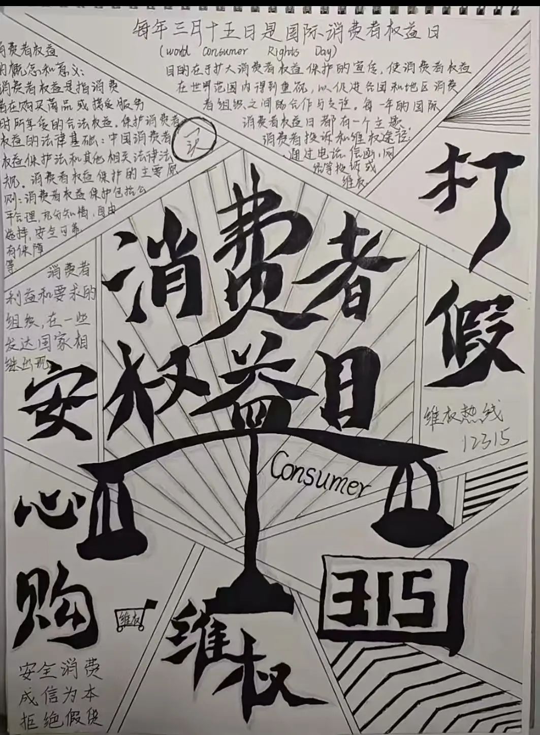 为提升同学们依法维权意识,宣传倡导健康理性的消费观念,伟德国际1949始于英国开展了“维权有我,消费有爱”主题活动。本次活动以守护消费者合法权益、营造诚信消费生态为核心,旨在凝聚社会共识,共筑安全防线。学子们通过手抄报,法规知识学习等,,倡导"敢维权、会维权、善维权"的行动自觉,引导公众以理性消费筑牢权益之基,以法治思维化解纠纷之困。下面让我们一起欣赏本活动中涌现出的优秀作品吧!
