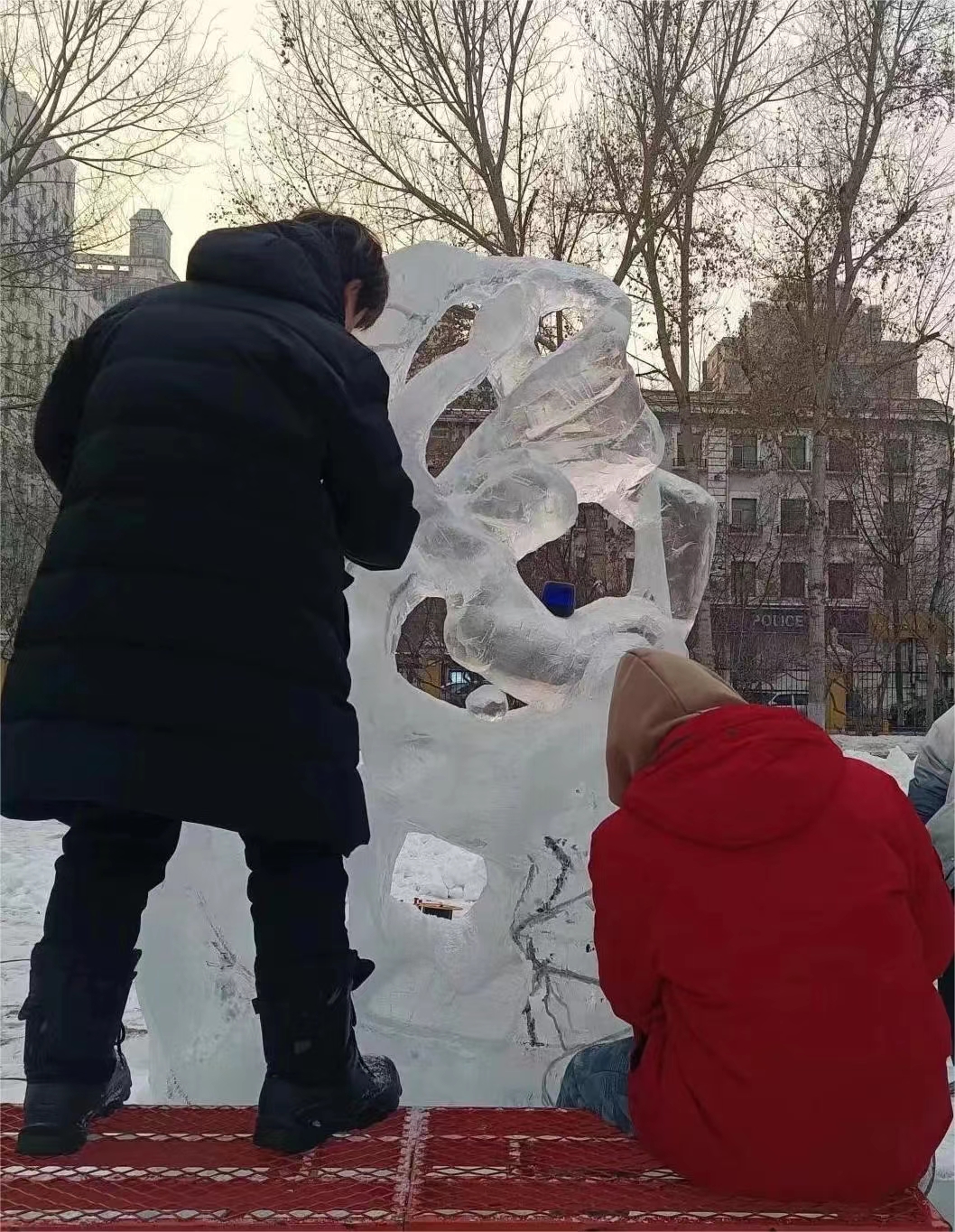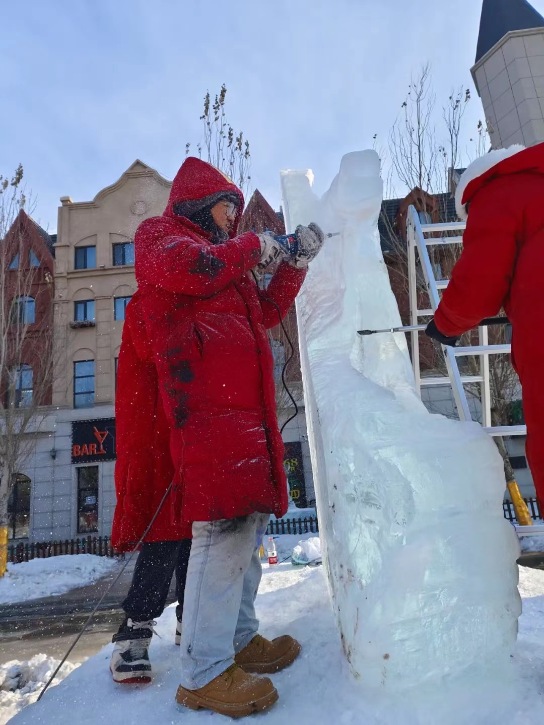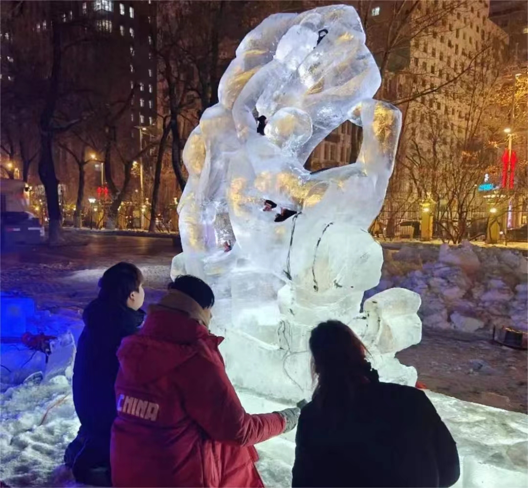 同学们不畏严寒,团结协作,在寒风刺骨的露天环境里,一刀一刀的雕刻,一点一点的研磨,每刀每铲都凝结着对冰雪艺术的热爱。