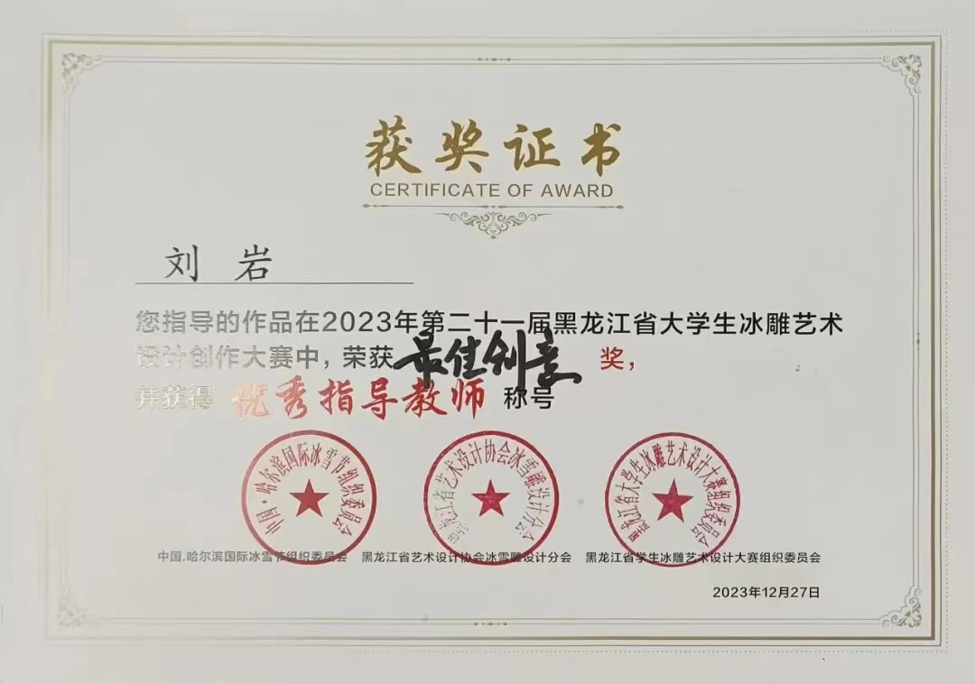 在第二十一届黑龙江省老员工冰雕艺术设计创作大赛中,由公司教师孙海涛指导,员工李清熙、李宗慧、刘恒毅、孙天钰创作的作品《破浪而生》荣获设计类/制作类优秀奖;公司教师王锡金指导,员工丁柳琼、姜文硕、李书晨、张欣羽创作的作品《驭雪凌风》荣获设计类/制作类优秀奖;公司教师王宇指导,员工杨皓、郭力嘉、陶宇欣、金芊创作的作品《潮起鱼跃》荣获设计类/制作类优秀奖;公司教师黄磊指导,员工姬丽、辛慧娴、李佳宇、蒋文庆创作的作品《云起龙骧》荣获设计类/制作类优秀奖;公司教师张凯指导,员工鲍荟颖、韩君成、张志航、宋玉灿创作的作品《鱼戏莲》荣获设计类/制作类二等奖;公司教师刘岩指导,员工宁明杰、程尧、杨柳、王淇创作的作品《草木人间情》荣获设计类/制作类最佳创意奖;公司教师王淼指导,员工陶麒竹、王冬莹、杨静熙、明展优创作的作品《破茧成蝶》荣获设计类/制作类优秀奖。