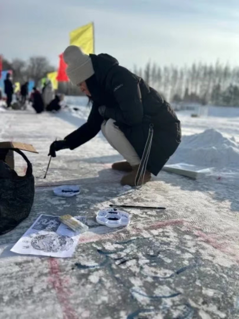 老师和队员们将思维灵感及艺术创新汇聚成利刃,借助冰刀刺入坚硬的冰版。带着艺术思维之中的旋律对冰刻画,形成凝固的音乐,创造出别样风格的艺术作品。为百米冰雪书画长卷添一笔色彩!